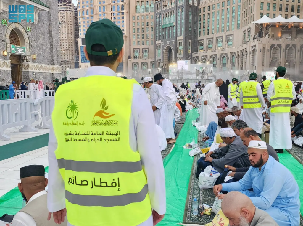 في حين تشحذ الهمم في نفوس كوادرها البشرية والفرق الميدانية، العديد من الجهات المعنية ومؤسسات المجتمع المدني ذات الطابع الإنساني؛ لأجل تقديم كل ما من شأنه للصائمين وضيوف الرحمن، في همة يظهر على مُحياها روح العطاء والبذل دون كلل أو ملل، وسط ابتسامات يملأها قدسية المكان، احتفاءً بشرف البيت العتيق ومكانة الأرض الطاهرة، فيما يسابق العاملين الخُطى في جمع موائد الإفطار بسباق محموم وفي مدة زمنية ووقت قياسي سريع، ليستوي آلاف المصلين في مشهد إيماني بديع، ويستقيموا لأداء صلاة المغرب المفروضة.